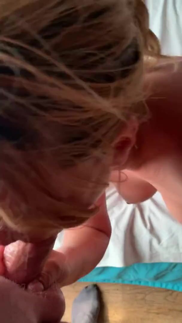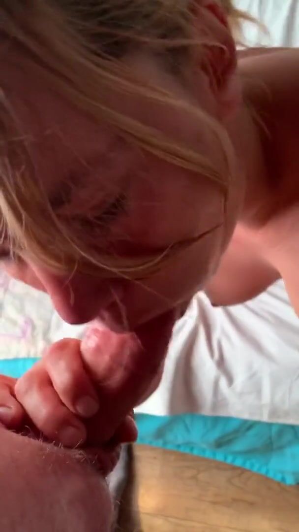 Amateur blonde with thick tits MILF has a squirt and then gets a good blowjob in the hotel
