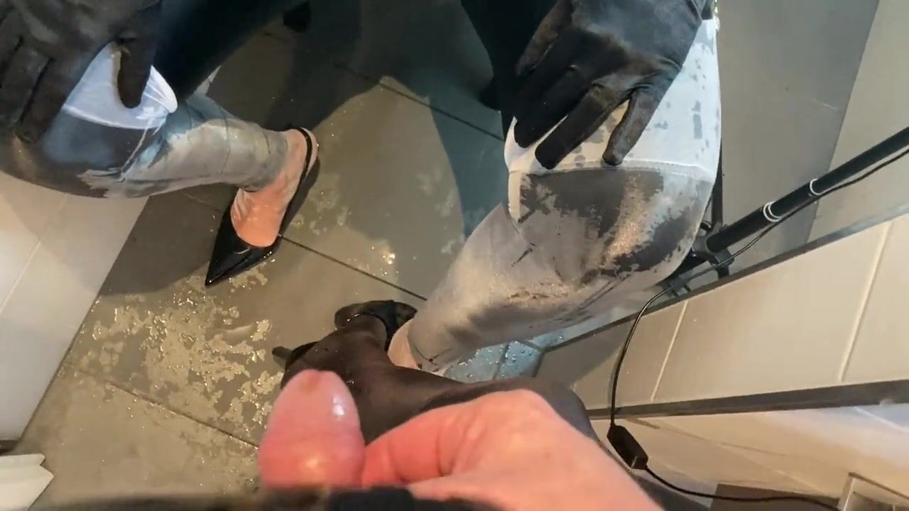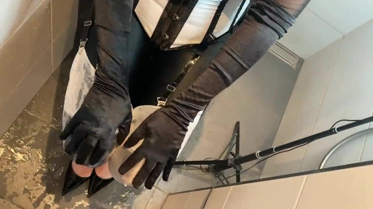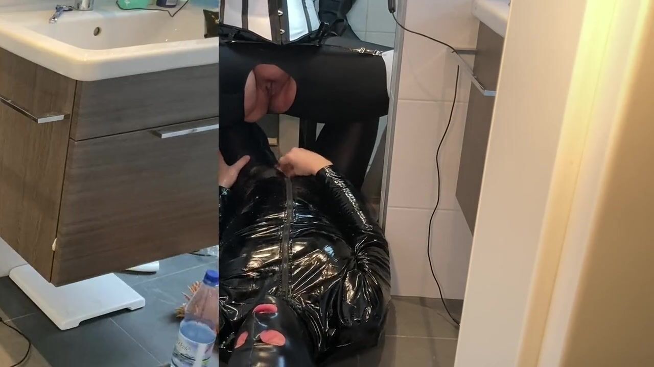 . My wife and me in fetisht outfits and high heels pissing on each other. she masturbates with a vibrator and receives a facial