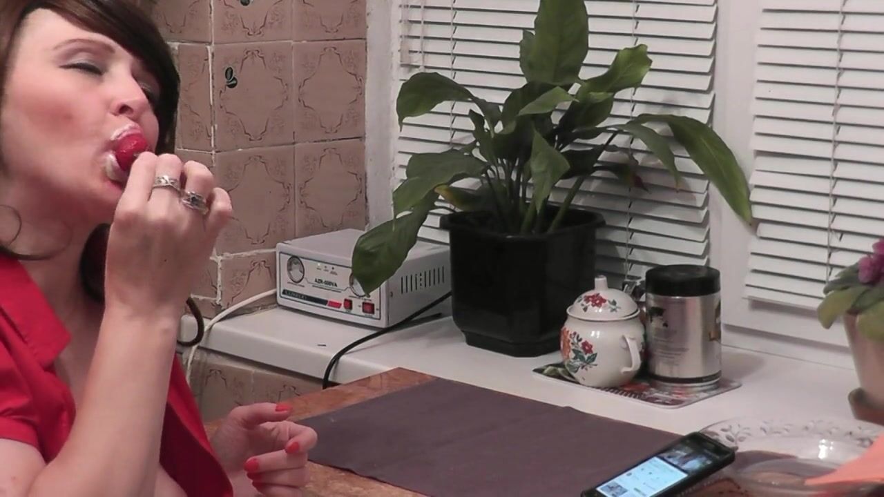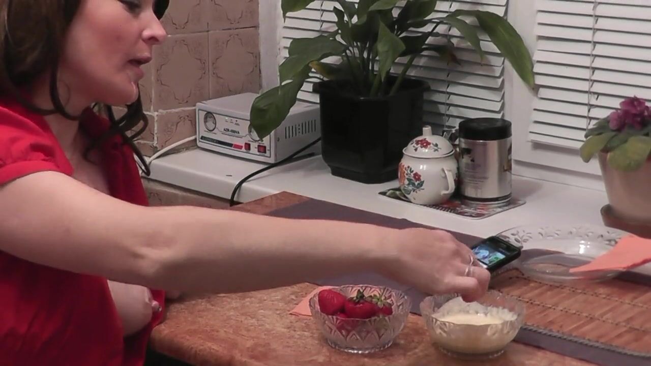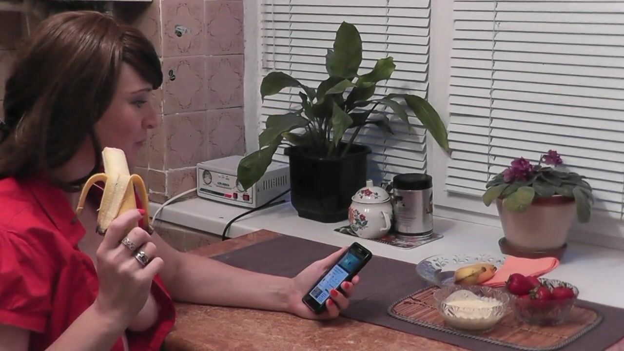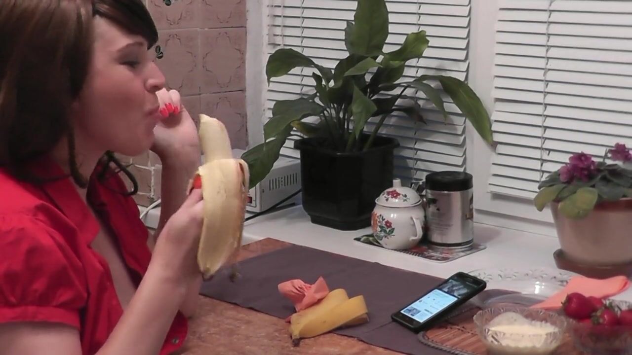 WITHOUT PANTIES IN KITCHEN BEAUTIFUL BRUNETTE MILF EATS BANANA FRUITS WITH CREAM FINGERING WET PUSSY AND ORGASM. HANDJOB