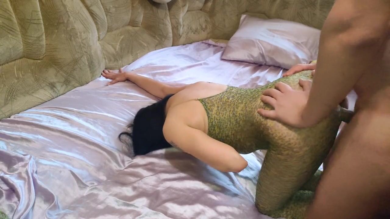 . sexy brunette with big tits, in a leopard suit, flesh-colored bodysuit, gives a blowjob, and exposes her ass to her husband, he cums first in the ass, then on the ass, the brunette got a double ending and during sex the girl finished many times, she loves squirt