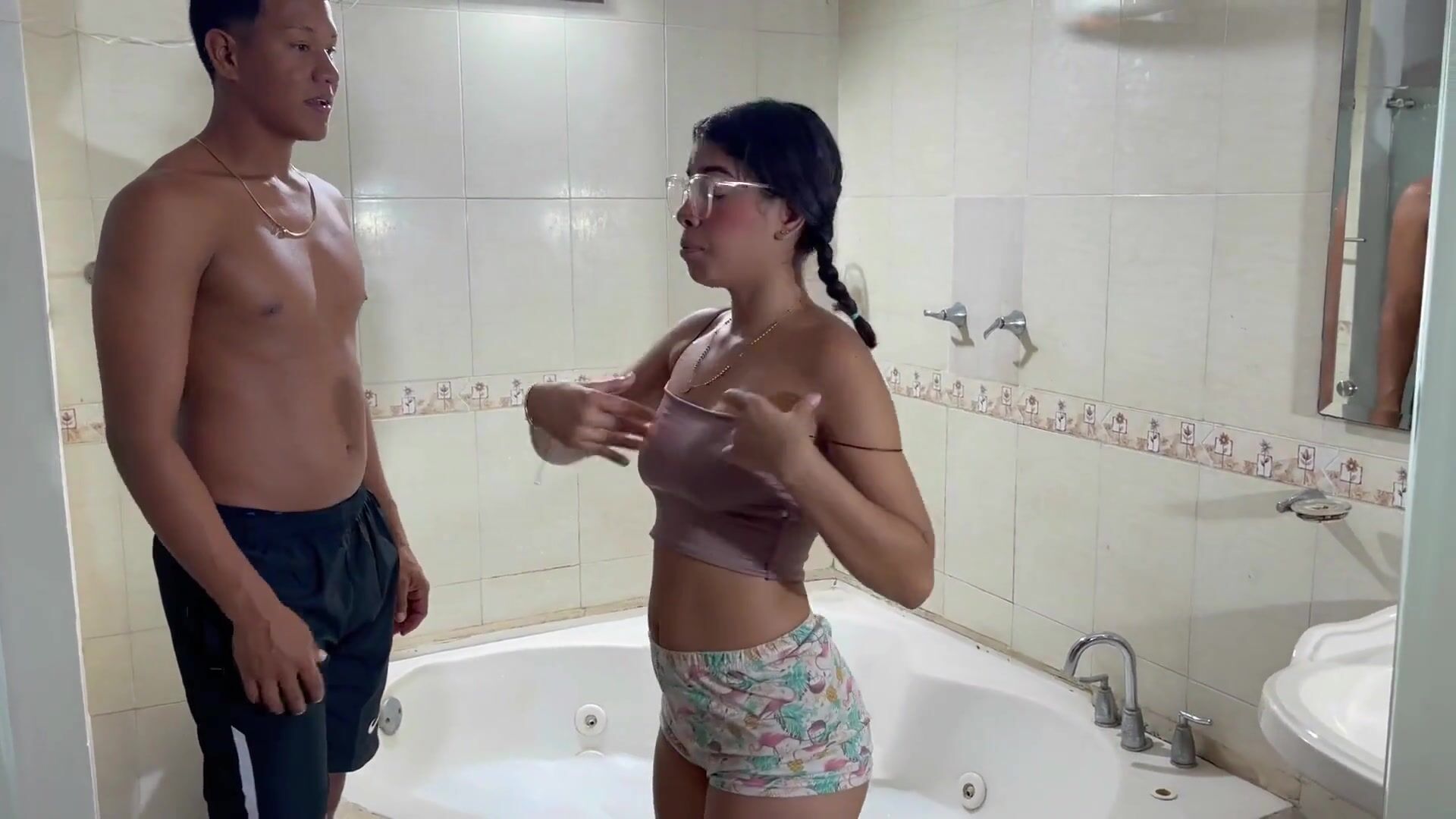 . While our stepfathers go out to do personal things we stay alone at home and my shy stepsister prepares a nice foam shower and I ask my shy stepsister to let me take a nice shower with her until the moment comes when she gets very horny and asks me to fuck her hard
